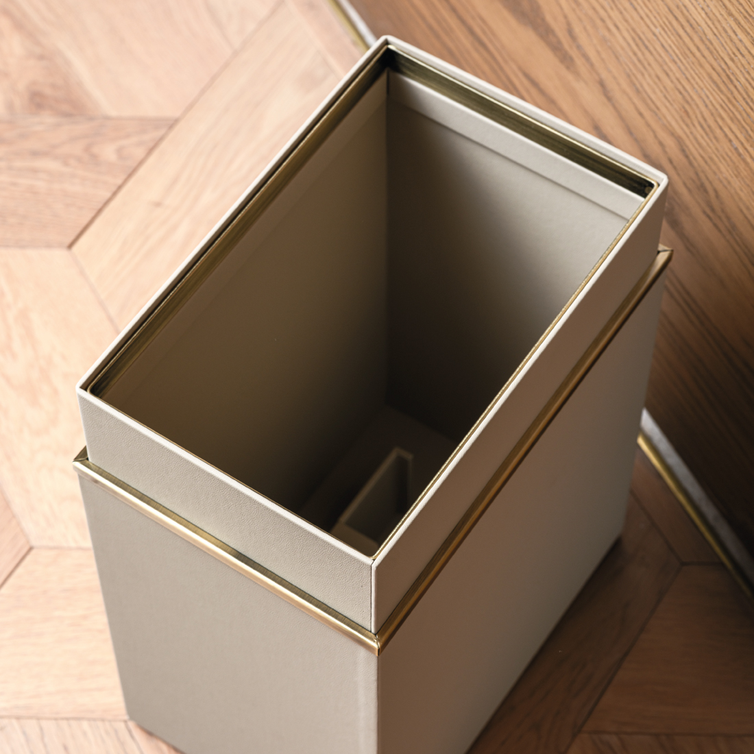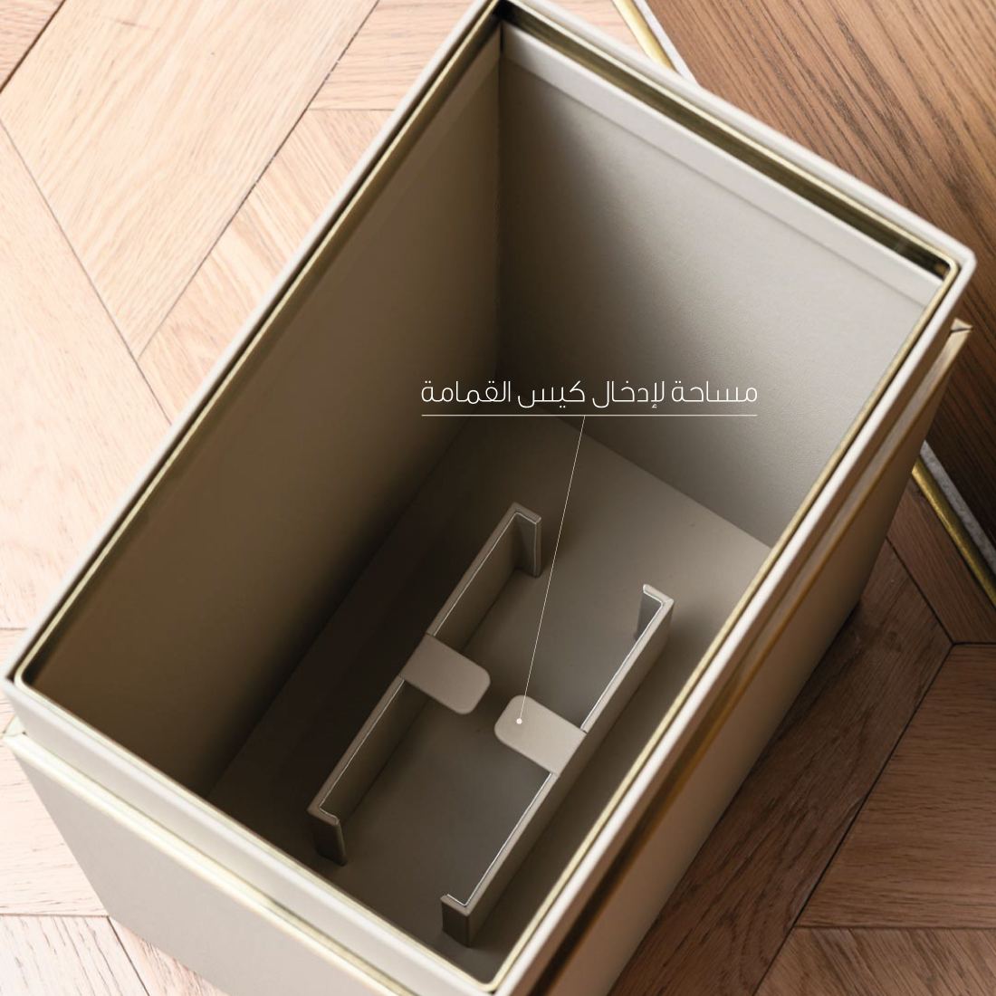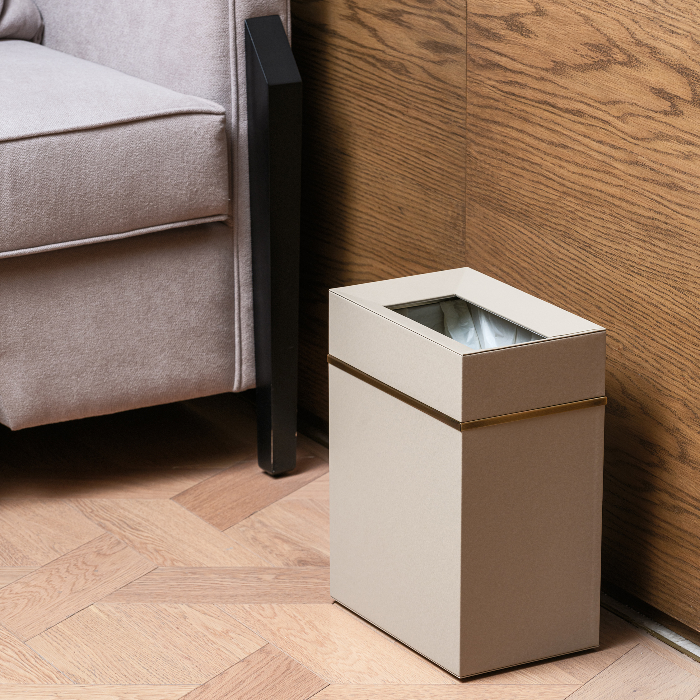 A practical trash bin has a built-in compartment to store bag rolls for convenient replacement.